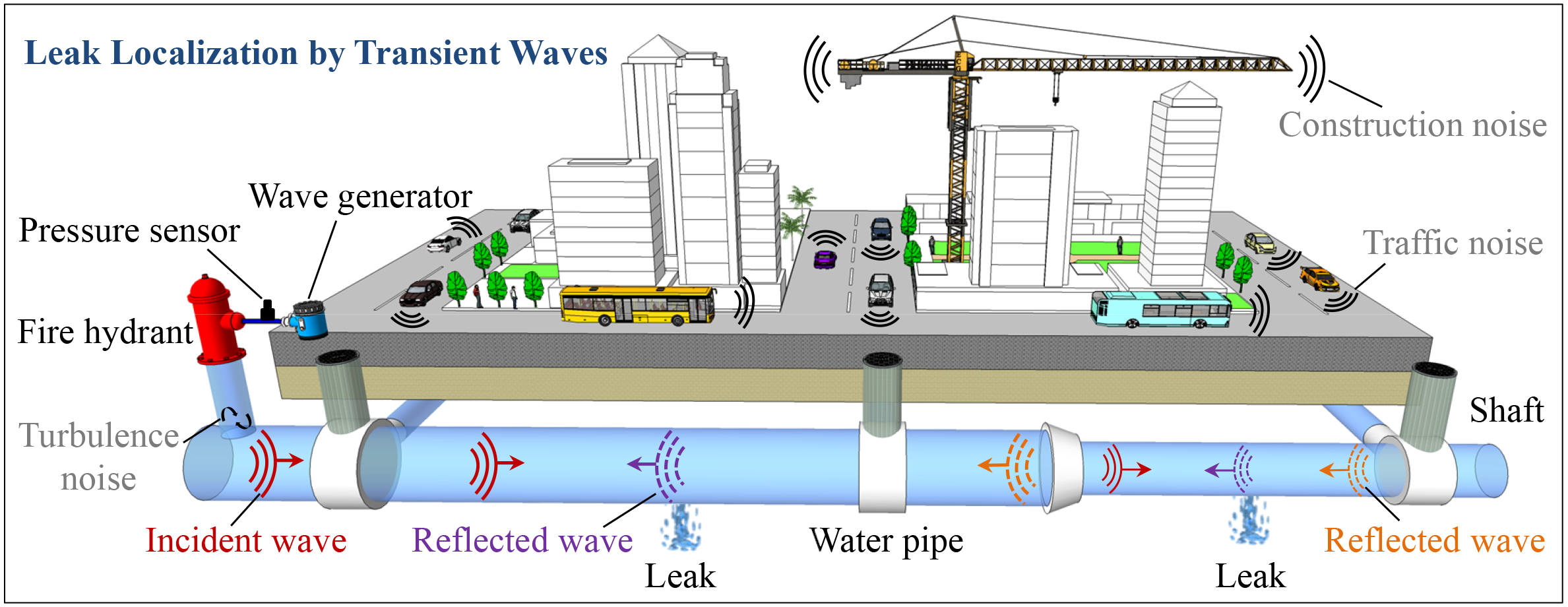 不同于单根管道,供水管网具有多路径波传播效应,导致“泄漏-水锤波-管网”之间的多重耦合作用异常复杂,其物理机理尚不明确。因此,研究团队以复杂供水管网为对象,融合水力学、水声学、反问题等领域的先进方法,从理论上严格推导了供水管网的水锤波解析模型,揭示了水锤波与泄漏及不同管网结构之间的多重耦合机理,并建立了基于匹配场处理的新型管网泄漏定位方法(Che et al.,2022a)。