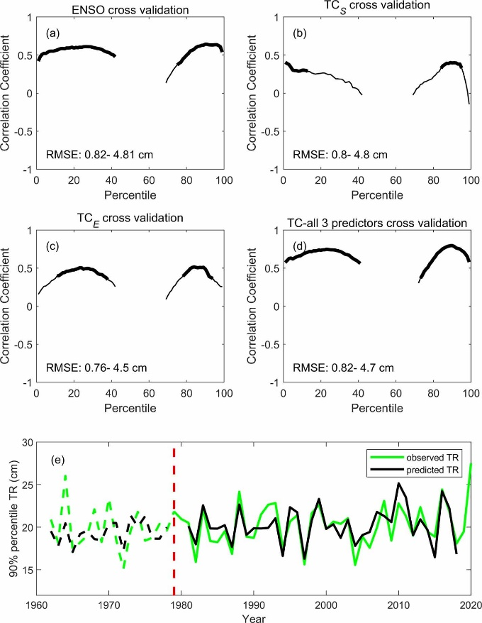 研究建立了以ENSO指数和气旋频率为预报因子的统计预测模型,并证明了模型对风暴潮水位有较好的预测能力(图2),极值水位预测值与实际观测值相关系数高达0.8。该分析方法可灵活应用于其它以气候变率和热带气旋为风暴潮主导因素的沿海地区,相较于传统的数值模拟方法具有计算精度高、成本低、适用性广的优点。研究为年际尺度的风暴潮极值水位预测提供了新方法,可在台风季来临前对当年的风暴潮情况进行预测,进而为防洪减灾政策制定和措施部署争取时间,具有重要的现实意义。