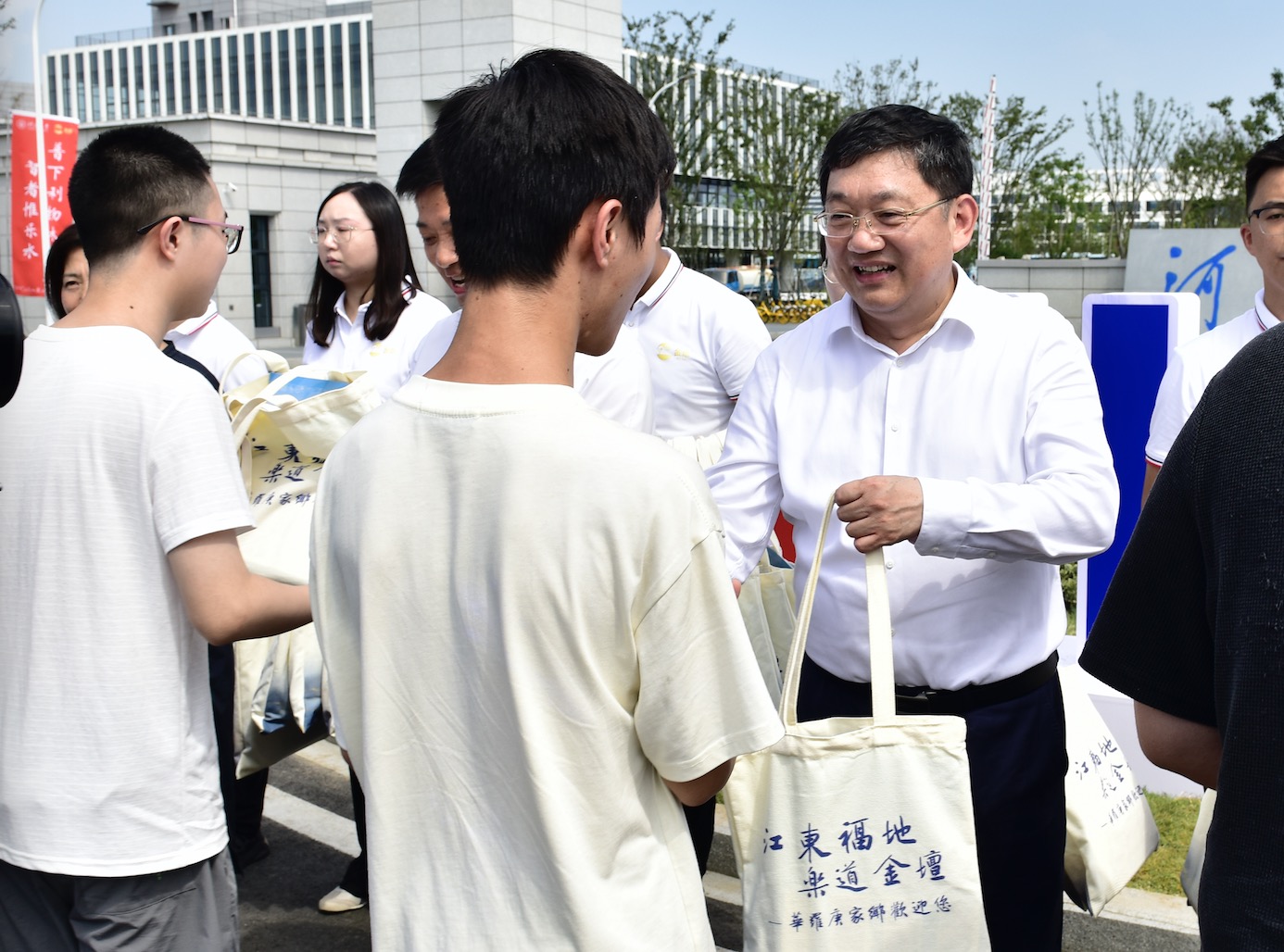 上午10:00,校地双方领导共同等候在校区南大门,随着满载学生的一辆辆大巴车缓缓驶入,领导们向入驻的2022级同学挥手致意,热烈欢迎他们成为新校区的主人。随后,校地领导一起为入驻学生送上贴心大礼包,含有金坛生活消费指南、“畅游金坛”尊享年卡、吾悦广场消费优惠券、免费乘坐公交车指南、扇子、金坛折页、文旅节目清单、清凉包等丰富物品,期待“‘河’你一起创造‘金’彩”。欢迎仪式结束后,校地领导共同来到师生教学及生活场所,走访了解校园情况,看望入驻师生,进行亲切交流,了解大家对于常州新校区的期待和对未来学习生活的展望,听取他们的意见建议。