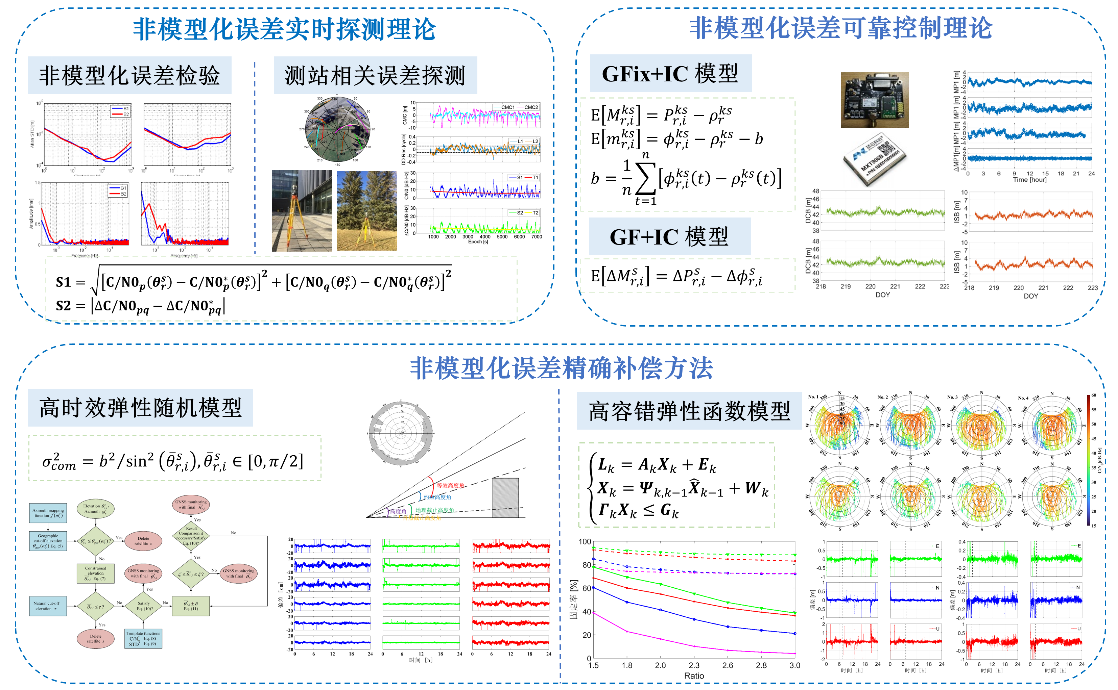 在非模型化误差精细处理方面,系统提出并研究了GNSS非模型化误差处理理论与方法。具体包括:构建了经典的GNSS非模型化误差实时探测理论,检验有效率达到90%以上;提出了GNSS非模型化误差精确补偿方法,重点包括高时效随机模型弹性优化策略以及高容错函数模型弹性调整方案,能使RTK和PPP精度稳定在厘米级甚至毫米级;给出了顾及非模型化误差的GNSS数据质量可靠控制策略,重点提出了几种易于实现的多路径、差分码偏差(DCB)和系统间偏差(ISB)的评估控制方法,有效提升了定位精度和可靠性。