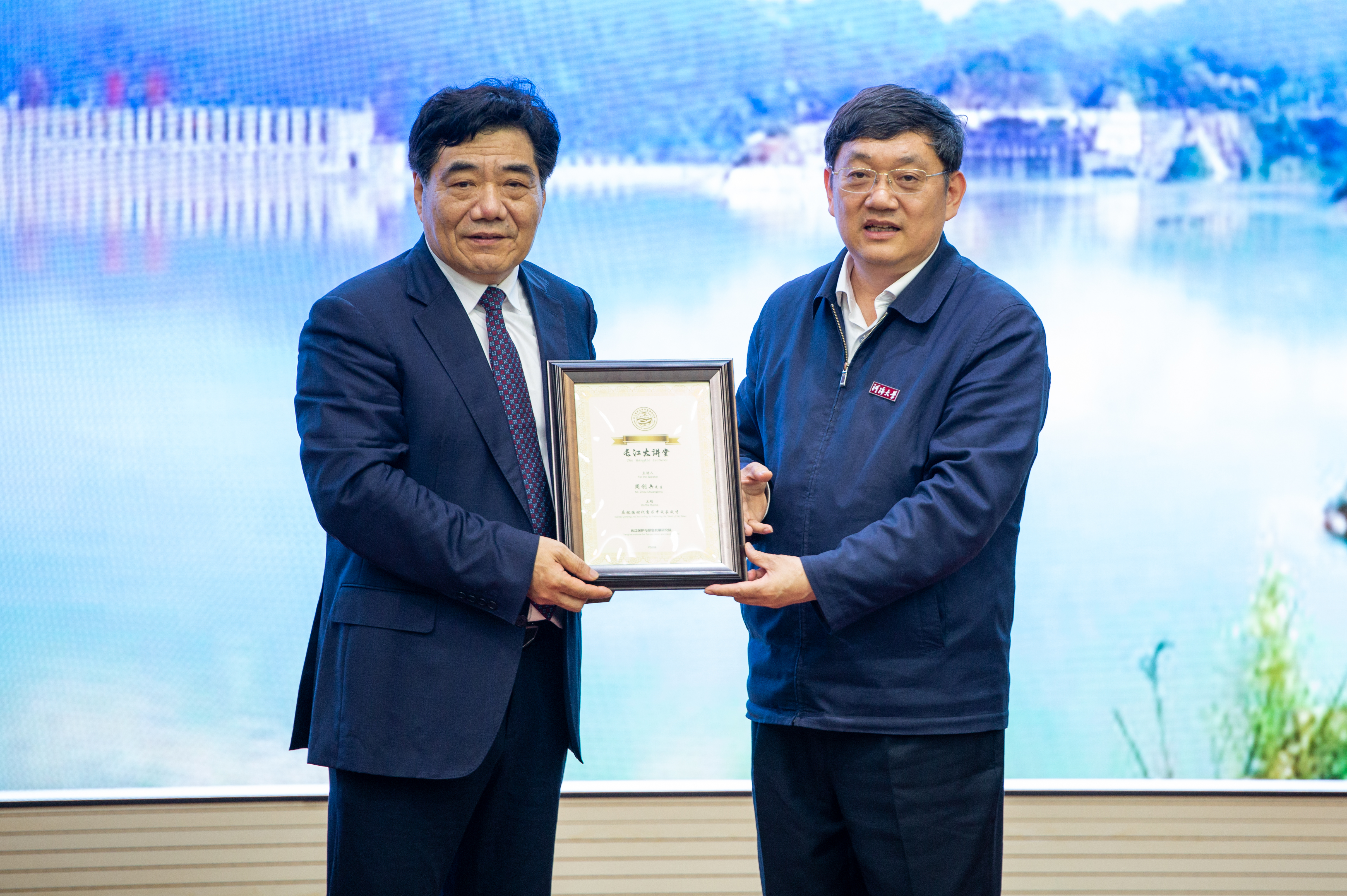 聘任仪式上,杨桂山为周创兵院士颁发荣誉教授证书并佩戴校徽。