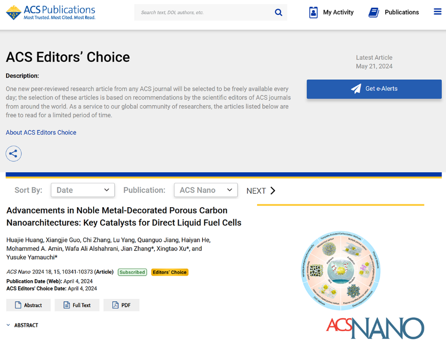 近日,我校材料院青年教师黄华杰在材料学国际著名期刊《ACS Nano》发表了题为“Advancements in Noble Metal-Decorated Porous Carbon Nanoarchitectures: Key Catalysts for Direct Liquid Fuel Cells”的研究成果,系统总结了贵金属修饰纳米多孔碳电催化剂在直接液体燃料电池中的应用。该成果被美国化学学会(ACS)选为ACS Editors' Choice亮点文章(图1)。