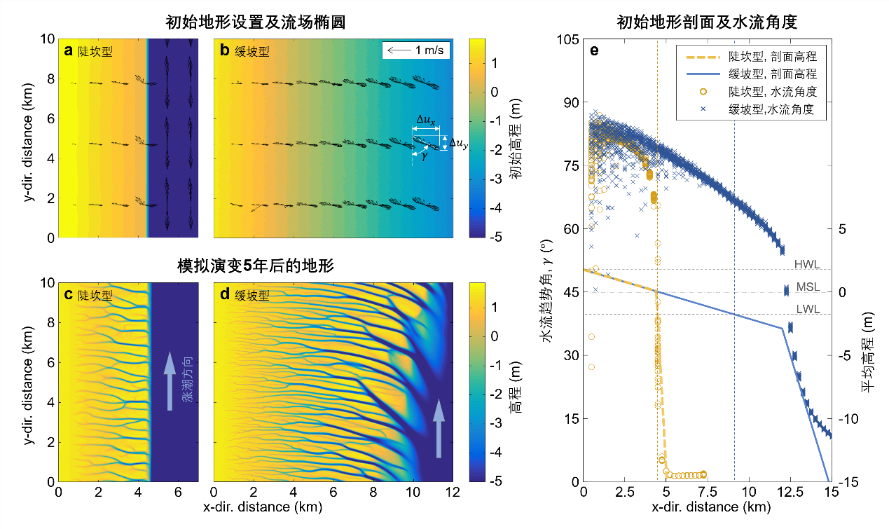 我校师生联合华东师范大学、新西兰奥克兰大学、意大利帕多瓦大学研究人员,通过遥感影像技术分析了全球的21处典型平行潮沟系统(图1),并结合海岸动力地貌学数值模拟对平行潮沟系统的形成与演变规律进行了深入研究。遥感分析的结果表明,相当一部分平行潮沟与岸线近似呈现90°夹角(图2),夹角大小受到剖面地形、水动力、植被等环境因子在沿岸方向上的均匀性控制,其中潮滩剖面形态是主要影响因素。通过对陡坎型和缓坡型两种潮滩演变过程的模拟(图3),发现陡坎型潮滩上沿岸流漫滩时迅速的流向偏转是使潮沟垂直于岸线的根本原因,而缓坡情况下流向平缓的过渡更容易形成弯曲、倾斜的潮沟。