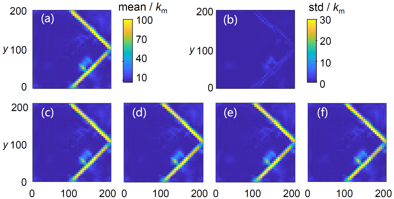 图2 (a) PEDL对水力渗透系数均值场的估计;(b) PEDL对水力渗透系数标准差场的估计;(c-f) PEDL对水力渗透系数场估计的随机样本。
