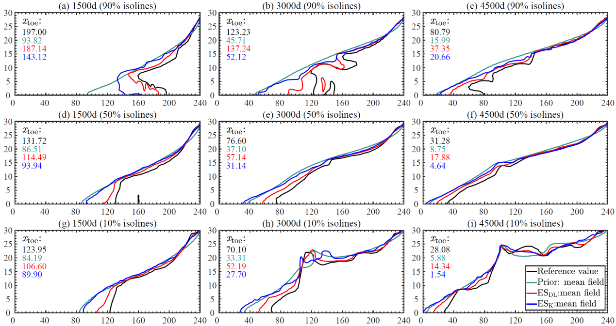 此外,团队将所发展的ESDL算法与海水入侵的科学治理紧密结合。实现地下水科学管理的前提是对其含水层特征进行有效刻画。然而,直接测量滨海含水层的参数存在较大困难。在这种情况下,团队借助数据同化技术,从容易观测的水头、浓度等数据出发,获得了对含水层参数更为准确的认识。通过实施ESDL算法,团队成功地提高了对海水入侵过程的预测精度(图3)。