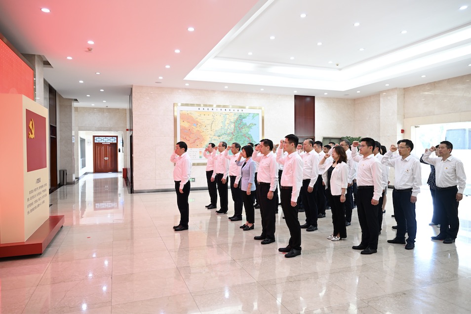 面向党旗,校党委书记唐洪武带领校“两委”委员庄严宣誓,重温入党誓词。唐洪武在讲话时指出,学校作为中国水利高等教育的开创者和引领者,要一体学习贯彻习近平总书记关于教育和治水的重要论述、对江苏工作的重要讲话重要指示精神,坚定拥护“两个确立”、坚决做到“两个维护”,紧扣国家重大战略需求,锚定方向、勇担使命,依托“得水独厚”的优势特色,紧密围绕国家“江河战略”和国家水网重大工程,紧密围绕习近平总书记赋予江苏“打造具有全球影响力的产业科技创新中心”“成为发展新质生产力的重要阵地”的使命任务,锻造核心竞争力、再塑发展新优势,为守护江河安澜、打造幸福河湖水美江苏、服务江苏在推进中国式现代化中走在前、做示范提供强有力的智力支持和科技支撑。