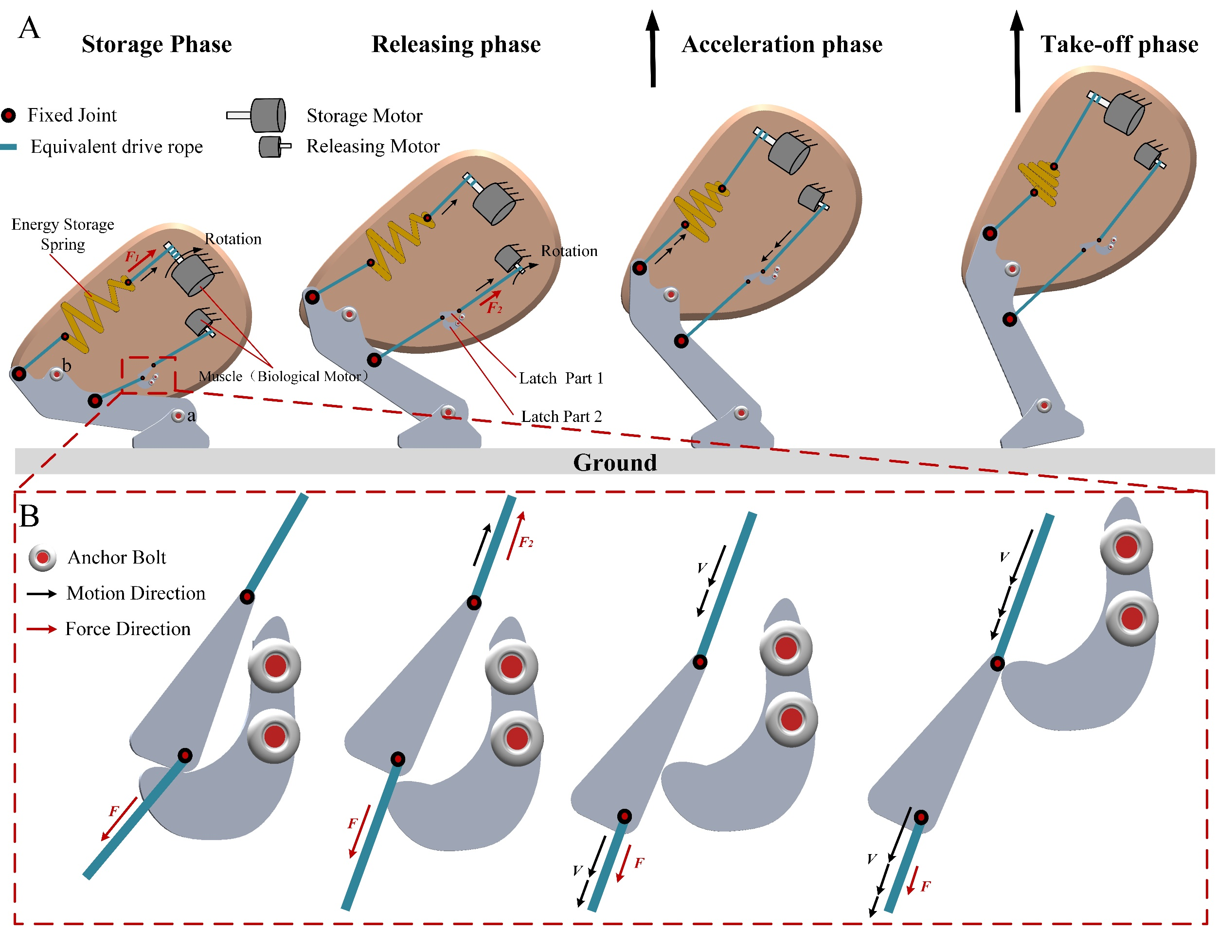 面对复杂的现实场景,单一的运动模式往往难以有效应对。跳跃机器人相对于传统的移动机器人拥有更强的越障能力,其可以轻易翻越数倍甚至数十倍于自身尺寸的障碍。在自然界中存在着许多具有优秀跳跃能力,高敏捷性的生物,尤其是昆虫类,它们的跳跃高度通常为身长的数倍至数百倍不等,例如蝗虫,跳蚤,吹泡虫等。通过对跳甲跳跃过程的拆解分析,其跳跃过程的等效模型如图1所示,该等效模型解释了其能够实现高速跳跃的普遍机理,生物肌肉的拉伸行程通常较为有限,但通过一定的机械增益可以将肌肉的拉伸行程放大。在等效机械模型中,甲虫的弹性外壳以及肌腱蛋白等被等效为一储能弹簧。在等效模型中对甲虫的跳跃过程进行拆解,同样的分为四个阶段,这四个阶段分别为:蓄能阶段、释能阶段、加速阶段和起跳阶段。