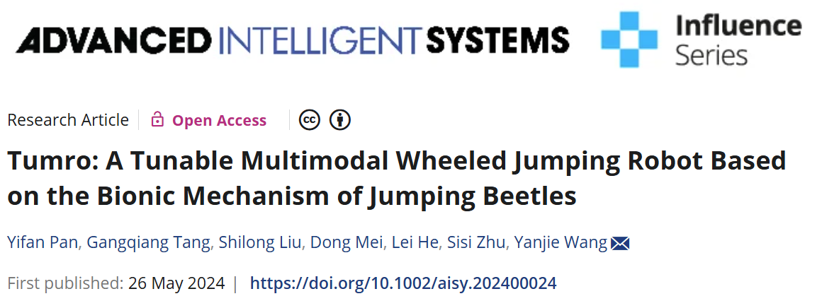 随着移动机器人技术的发展,大多数的场景下机器人已经能够取代人工进行工作与探测。但在一些复杂的场景下,传统的单一运动模式机器人往往难以有效工作。因此现阶段机器人朝着更加灵活,多功能的方向发展。传统移动机器人的障碍穿越能力有限,在面对高于自身高度的障碍物例如楼梯、碎石、沟渠等非结构路面时甚至难以移动。跳跃机器人相对于传统的移动机器人拥有更强的越障能力,其可以轻易翻越数倍甚至数十倍于自身尺寸的障碍。近日,开云电竞网江苏省特种机器人重点实验室王延杰教授团队在国际期刊Advanced Intelligent Systems上发表以“Tumro: A Tunable Multimodal Wheeled Jumping Robot Based on the Bionic Mechanism of Jumping Beetles”为题的研究性论文。该工作从以跳甲的蓄能跳跃机理出发并结合功乘原理,提出了一种小电机驱动的具有多种运动模式的小型跳跃机器人(图1),该机器人具有快速的轮式运动与优良的跳跃运动,有望在未来的复杂地形探测以及地外低重力行星探测发挥作用。目前该工作已被Advanced Science News报道(https://www.advancedsciencenews.com/meet-tumro-a-jumping-robot-inspired-by-beetles/,开云电竞网王延杰教授为该论文的独立通讯作者,硕士研究生潘一帆为论文第一作者