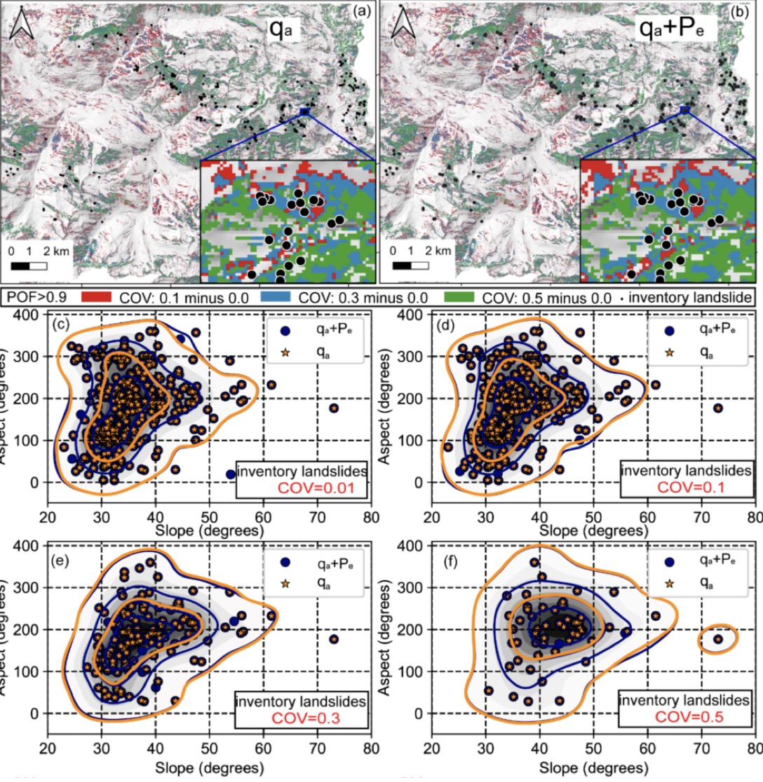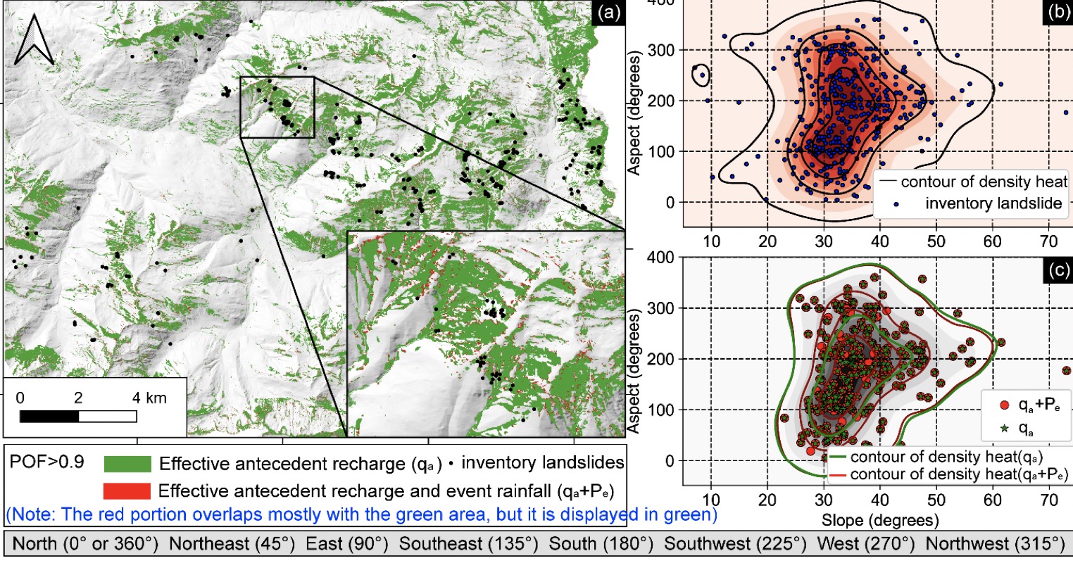 图2:基于FSLAM-FORM概率分析得到的极高易发性结果:(a)区域分布图;考虑坡度与坡向的聚类效应(b)实际滑坡点位置;(c)不同降雨条件