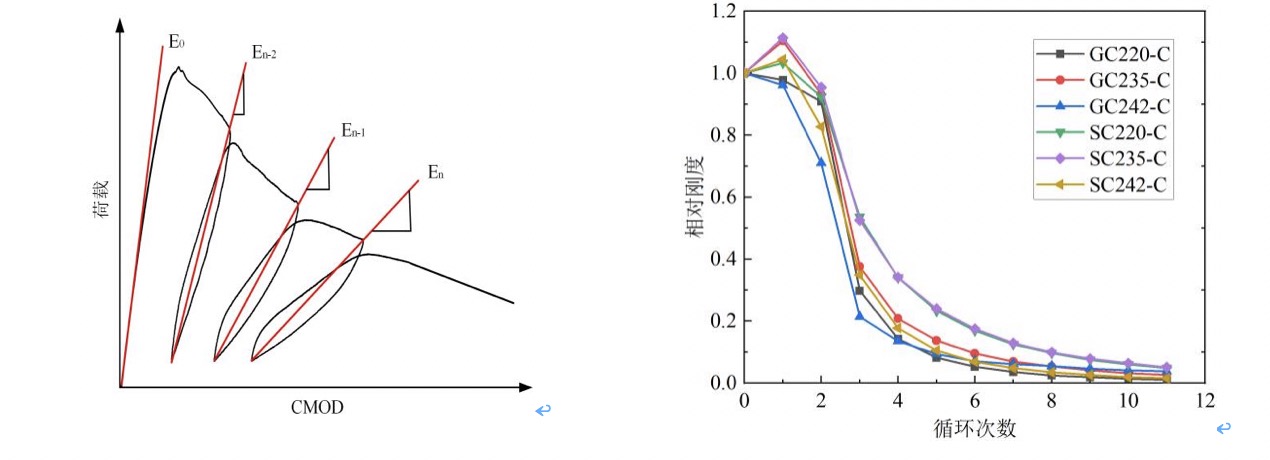 进一步分析了湿喷混凝土-围岩界面Ⅰ-Ⅱ复合型裂缝的断裂机理,采用机器学习方法对 RA-AF 数据进行分析,实现了湿喷混凝土-围岩界面Ⅰ-Ⅱ复合型断裂过程中的“拉伸”与“剪切”的两种断裂模式的有效分类(图2),分析了模态角变化对湿喷混凝土-围岩的四点剪切断裂机理的影响。在上述分析基础上,采用了荷载-CMOD 滞回曲线的割线模量表征试件的损伤特征(图3),阐明了湿喷混凝土-围岩复合结构四点弯曲断裂机理。对机器学习算法识别出的声发射损伤信号进行了分阶段处理,实现了循环荷载作用下湿喷混凝土-围岩结构四点剪切断裂过程中的剪切与拉伸损伤的定量识别,揭示了循环荷载中加载与拉伸损伤比例之间的协同关系(图3)。