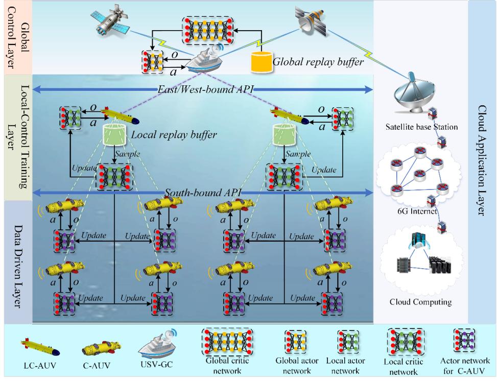 针对自主水下航行器在复杂海洋环境下智能性差、信息交互复杂的问题,该团队将软件定义网络技术与多智能体强化学习技术相结合,并受“层次化”的启发,提出了基于层次化的软件定义多智能体强化学习架构,建立了层次化的AUV集群网络模型,如图3所示,其将AUV集群网络划分为三层,并利用多智能体强化学习为每一层进行任务部署。同时,在理论层面上,受“优势互补”的启发,该团队提出了“优势注意力”机制和“优势重采样”的理论,并在此基础上提出了基于“优势互补”的多智能体强化学习算法。具体来讲,该算法旨在训练过程中挑选最优(奖励值最大)的智能体,并利用最优智能体的信息帮助其它智能体学习,进而加速算法收敛。仿真结果表明,该团队提出的算法可以有效利用优势智能体的信息,高效提升了多智能体强化学习算法的收敛速度,提升了AUV集群网络的目标追踪精度,并在大规模AUV集群网络下实现了高效的目标追踪。