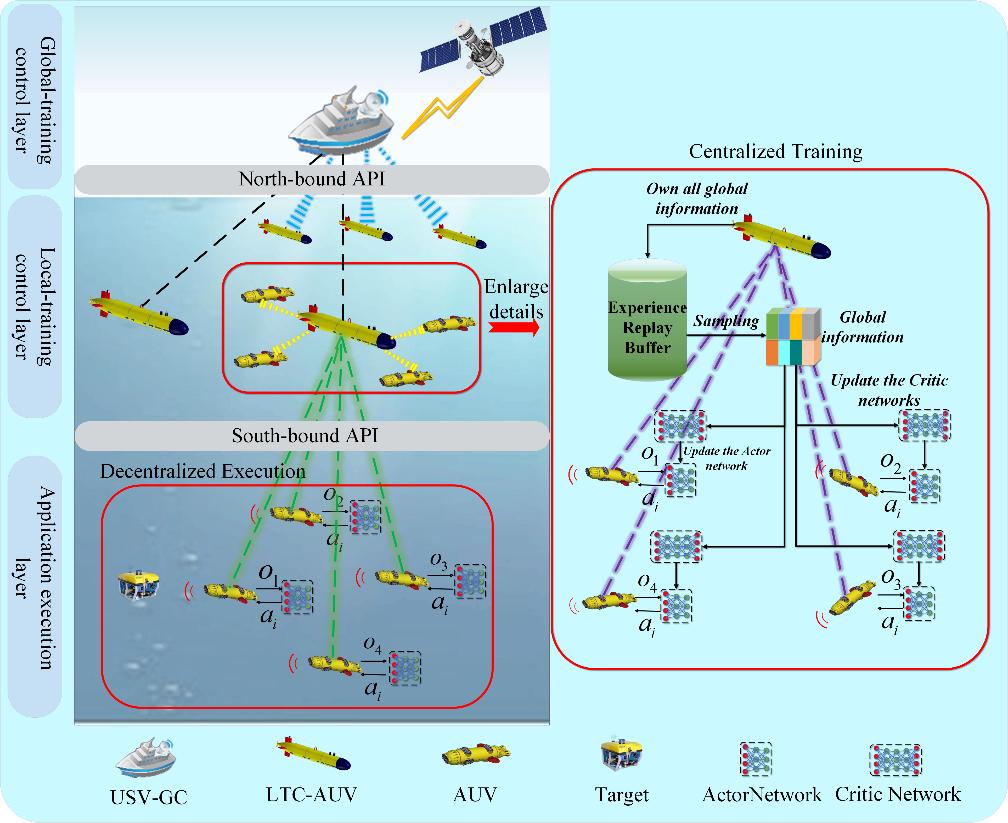 在单个AUV路径规划研究的基础上,韩光洁团队进一步探讨了AUV集群网络的智能追踪问题。他们深入剖析了多智能体强化学习技术与软件定义技术的共同点,提出了软件定义多智能体强化学习范式。该范式利用软件定义技术的集中控制和分布式运转特点,结合多智能体强化学习的集中训练与分布式执行模式,赋予了AUV集群网络在目标追踪任务中的智能化和集中化能力。针对AUV集群网络在目标追踪过程中扩展性差和维度爆炸的问题,该团队设计了MA-A3C算法,成功应对了AUV集群网络在复杂环境中的智能控制挑战,并显著提升了多AUV在目标追踪任务中的成功率和计算效率。