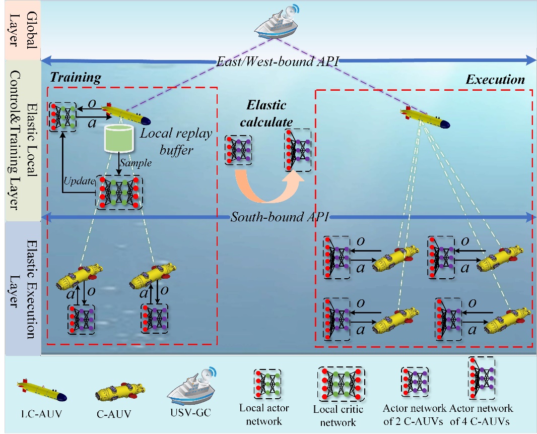 近日,我校信息科学与工程学院韩光洁教授团队针对AUV集群网络在复杂海洋环境下的可扩展性目标追踪问题,在架构层面,集成了多智能体强化学习算法和软件定义网络技术的优势,建立了弹性计算的模型,创新性的提出了弹性软件定义多智能体强化学习架构,如图1所示,以动态调整AUV集群网络中AUV的数量,增强了AUV集群网络的扩展性。该团队在此基础上,在理论层面,设计了增量式多智能体强化学习算法,建立了神经网络可解释的计算模型,以无需再训练的方式提升了多智能体强化学习的扩展性,突破了多智能体强化学习扩展性差的理论限制。实验结果表明,该团队所提出的方法可以有效的以无需再训练的方式实现AUV数量的动态扩展,并保证高效的目标追踪效果。