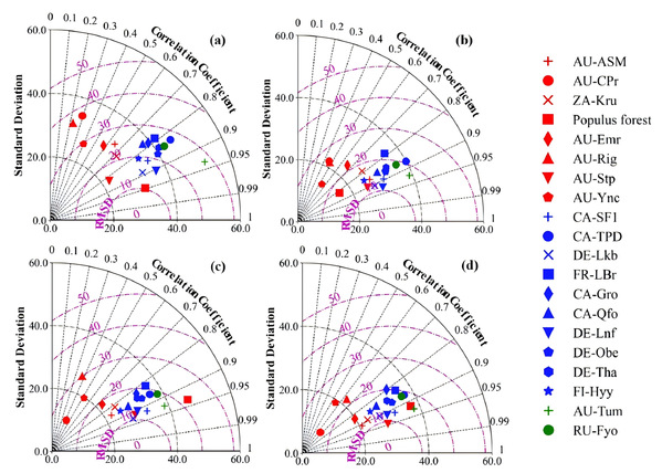 图1 四种方法在全球通量站点处的蒸散测算精度泰勒图(a. NP方法,b. SFE-NP方法,c. RH-PM方法,d. TS-NP方法)