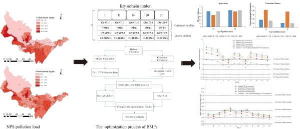 在综合环境建模和管理中,大量多目标优化问题不仅涉及连续决策变量,还包括整数变量和离散变量,此外这些优化问题往往具有各种约束条件。团队提出了一种能够处理具有约束条件的混合变量多目标优化问题的MO-ASMOCH方法。研究结果表明MO-ASMOCH仅需要NSGA-II计算时间的5%-27%,就能够得到相似的优化效果。后续工作利用MO-ASMOCH开展了基于SWAT模型的非点源污染最佳管理措施多目标优化研究,通过高效优化不同管理策略的组合,能够有效减少污染物排放并提升水质管理的综合效益。