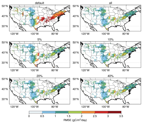 图2 采用默认参数、MO-ASMO基于全部网格优化的参数、MO-ASMOGS在不同网格采样水平下优化的参数所模拟GPP的RMSE值的空间分布
