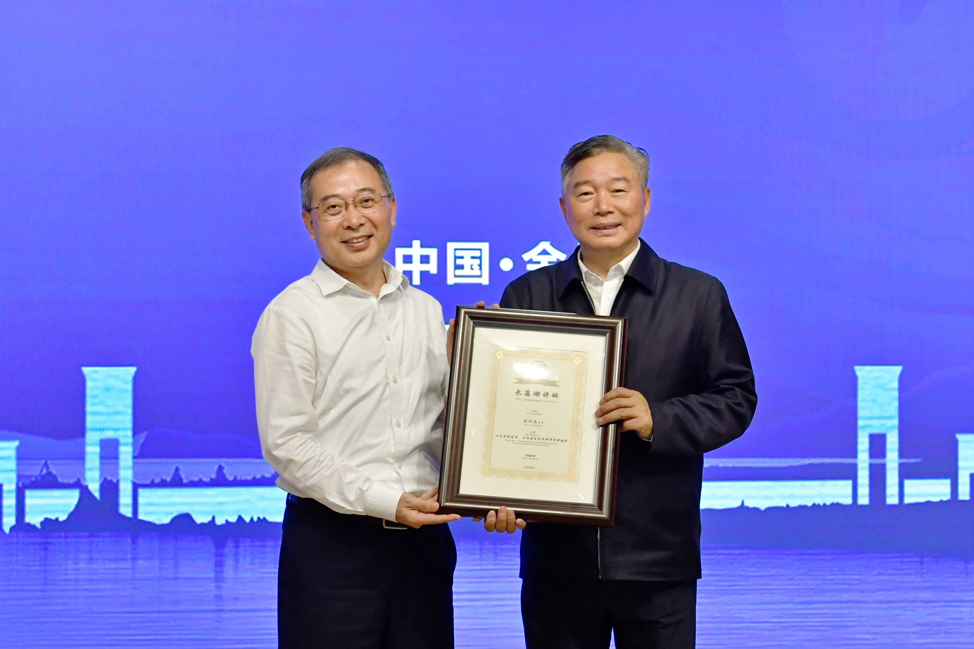 杨桂山为刘汉龙颁发纪念证书,并在总结讲话中勉励广大师生在绿色建造、生态工程等领域深耕细作,让学术成果切实服务国家发展需求,扎根祖国大地,为推动人与自然和谐共生的现代化建设贡献河海力量。
