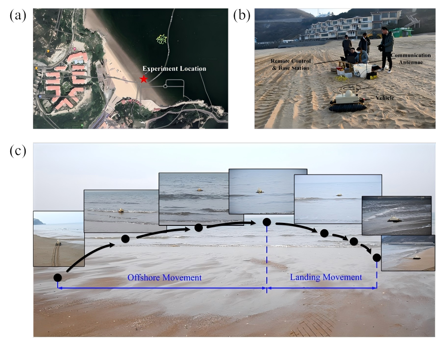 为验证系统设计的实用性,团队进行了系统性的实地测试,验证场景覆盖多种典型地形,包括沙地、碎石路面、草地、爬坡、越障等,展现了良好的地面通过性。此后,团队在连云港市大沙湾海域完成了自主离岸与登陆试验(图4),测试了该平台的水陆转换能力,充分体现了其环境适应性。