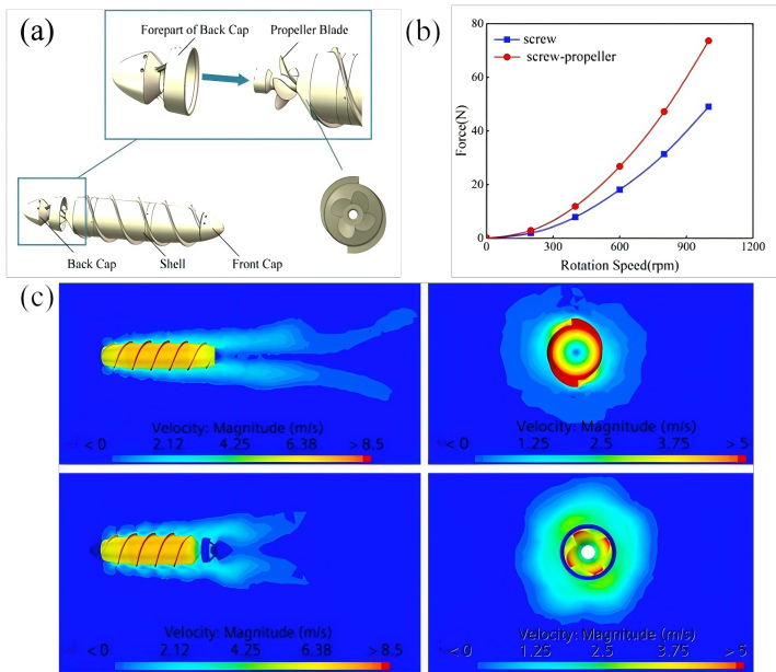 为深入揭示其中的科学问题,团队开展了一系列水动力数值模拟,探究了螺旋设计参数对螺旋推进性能的影响,提出了螺旋体在水中推进的力学模型。在此基础上,创新性地提出了一种带桨叶的螺旋体结构,进一步大幅提升了水下螺旋驱动效能。