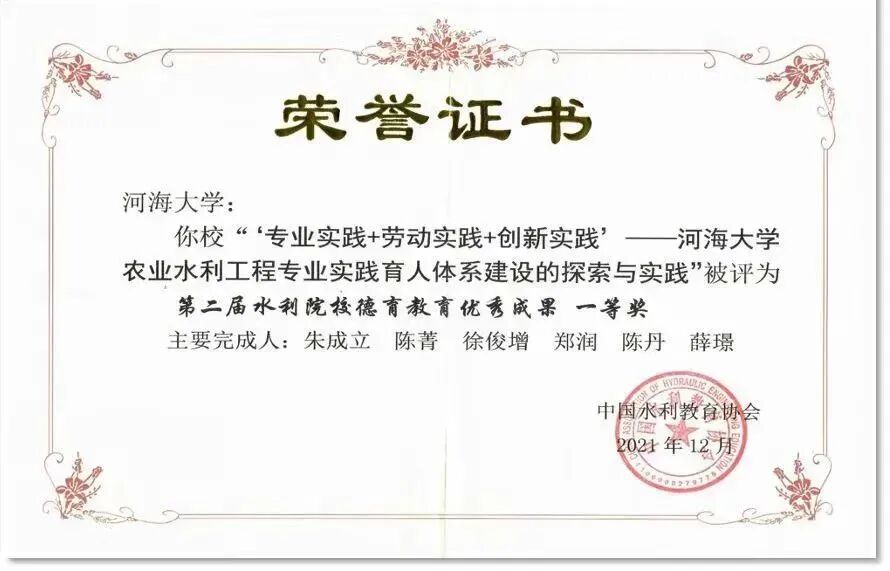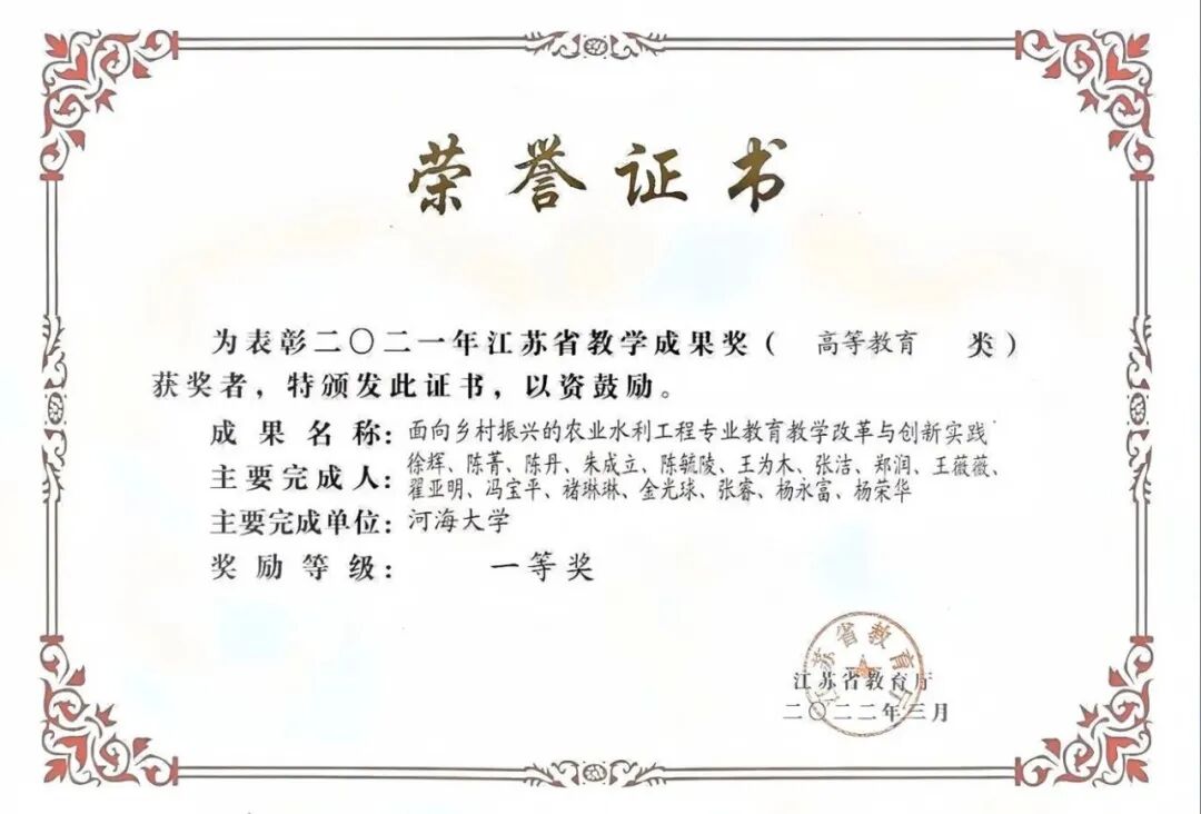 农业水利工程专业通过教育部工程教育专业认证,入选首批国家级一流本科专业建设点。1门课程入选首批国家级一流本科课程,3门课程入选江苏省一流本科课程,1部教材入选江苏省高等学校重点教材,获批首批教育部新农科研究与改革实践教改项目2项、江苏省高等教育教改研究立项课题2项,获江苏省教学成果奖一等奖1项,水利院校德育教育优秀成果一等奖1项,中国水利教育协会教育教学成果奖一等奖2项,江苏省普通高校本专科优秀毕业设计(论文)三等奖2篇,江苏省优秀博士学位论文3篇、优秀硕士学位论文1篇。
