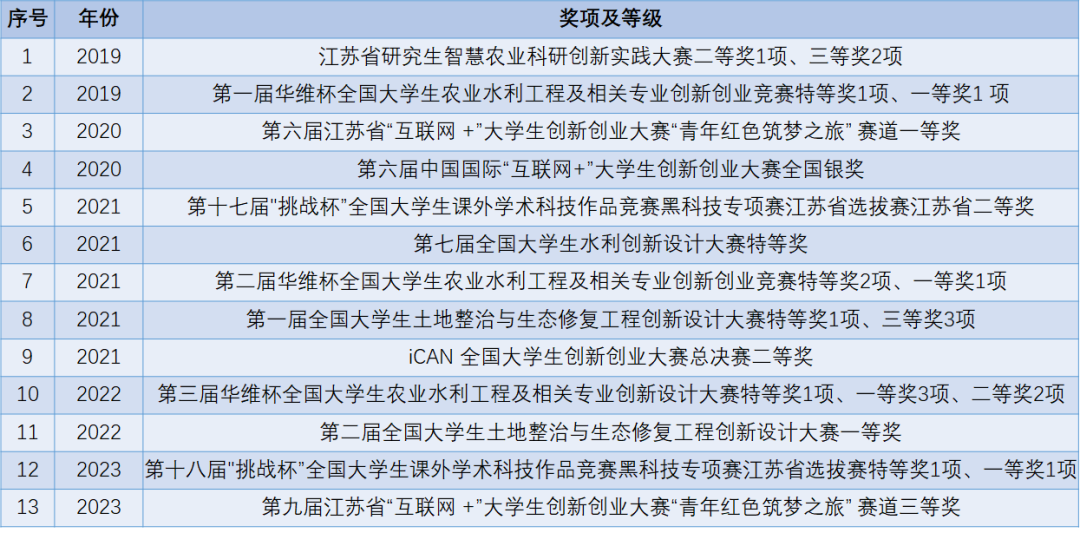 构建了基于第二课堂的农业水利专业创新人才培养体系,依托学院教学、科研、大创三大育人平台,以院-校-行业-国家综合四级竞赛培育实施为路径,培育新农科特色创新项目,学生在国家级、省级重要赛事中屡获佳绩。先后获得中国国际“互联网+”大学生创新创业大赛全国银奖;江苏省“互联网+”大学生创新创业大赛“青年红色筑梦之旅”赛道一等奖、三等奖各一项;“挑战杯”全国大学生课外学术科技作品竞赛黑科技专项赛江苏省选拔赛特等奖、一等奖、二等奖各一项;华维杯全国大学生农业水利工程及相关专业创新创业竞赛特等奖;全国水利创新设计大赛特等奖;全国大学生土地整治与生态修复工程创新设计大赛特等奖等多个国家级、省级奖项。“水韵农青”大学生科技志愿队入选2022年全国300支大学生科技志愿服务示范团队,活动案例入选全国大学生科技志愿服务百强。