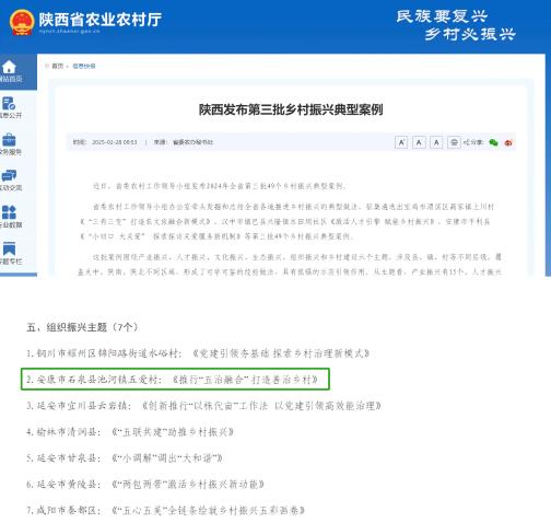 近日,中共陕西省委农村工作领导小组评选出第三批全省乡村振兴典型案例,安康市一共入选6个乡村振兴典型案例,其中,我校定点帮扶的陕西省石泉县五爱村《推行“五治融合”打造善治乡村》入选“组织振兴主题”。